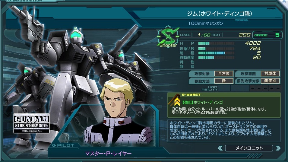 一覧 量産機 | エース | MA 最終ステータス 量産機 | エース | MA 比較データ エースGバースト | シリーズ別早見表 | 特性早見表| MS索引 赤字はレベルアップによるMAX値 基本ステータス