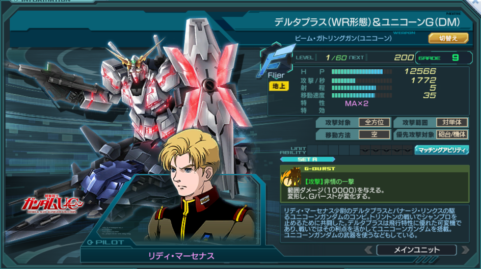 一覧 量産機 | エース | MA 最終ステータス 量産機 | エース | MA 比較データ エースGバースト | シリーズ別早見表 | 特性早見表| MS索引 赤字はレベルアップによるMAX値 基本ステータス