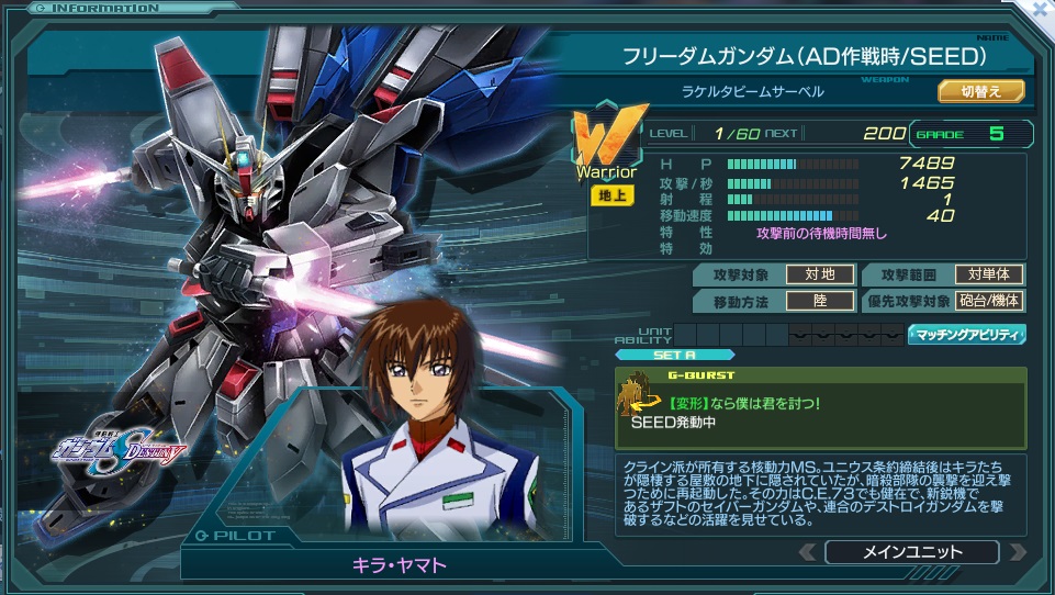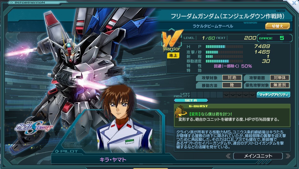 | Warrior | 特性 | 回避(一部除く)50% 回避成功時、攻撃力+2%(蓄積可)※変形後も状態を引き継ぐ ※G11時 ACE・MA×1.2 | ||