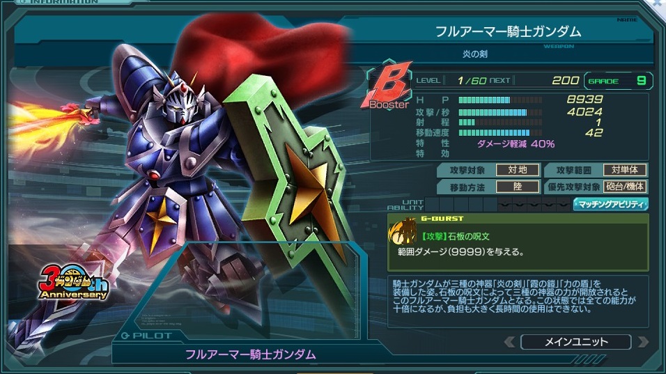 | Booster | 特性 | 吸収無効、被弾時攻撃力+2%、ダメージ軽減40% 残りHPが25%以下になると一度だけHPを100%回復する 通常攻撃と攻撃Gバーストからの受けるダメージ上限値:3500 | ||