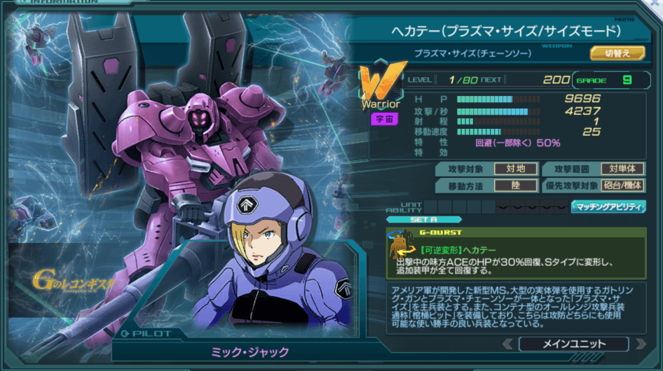 | Warrior | 特性 | 回避(一部除く)50% 命中50% ダメージ軽減50% ひるまない 追加装甲が受けたダメージの合計が2500以上になる度、ACEへの特性倍率+5%(蓄積可)※変形後も状態を引き継ぐ Gバーストを使用する度8秒間、ステルスになる。※発動毎にリセット | ||