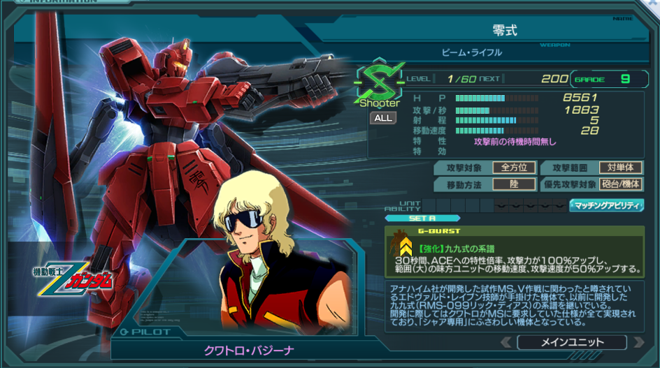 一覧 量産機 | エース | MA 最終ステータス 量産機 | エース | MA 比較データ エースGバースト | シリーズ別早見表 | 特性早見表| MS索引 赤字はレベルアップによるMAX値 基本ステータス