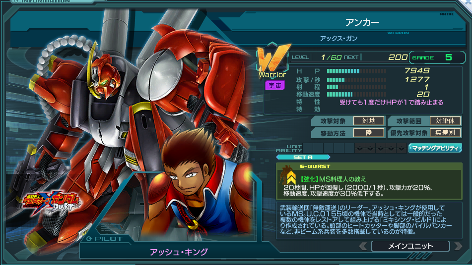 一覧 量産機 | エース | MA 最終ステータス 量産機 | エース | MA 比較データ エースGバースト | シリーズ別早見表 | 特性早見表| MS索引 赤字はレベルアップによるMAX値 基本ステータス