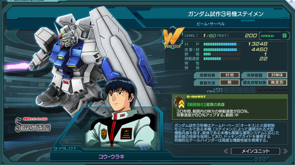 一覧 量産機 | エース | MA 最終ステータス 量産機 | エース | MA 比較データ エースGバースト | シリーズ別早見表 | 特性早見表| MS索引 赤字はレベルアップによるMAX値 基本ステータス