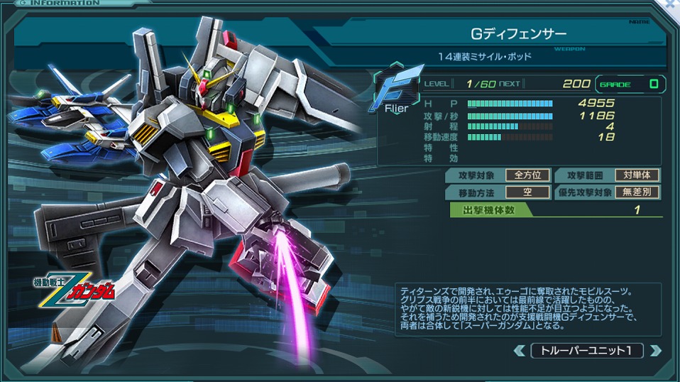 専用Gバーストを使用することで、メインユニットは射程7のF型(砲台/機体優先)のスーパーガンダムへと変形し攻撃/秒が上昇、
