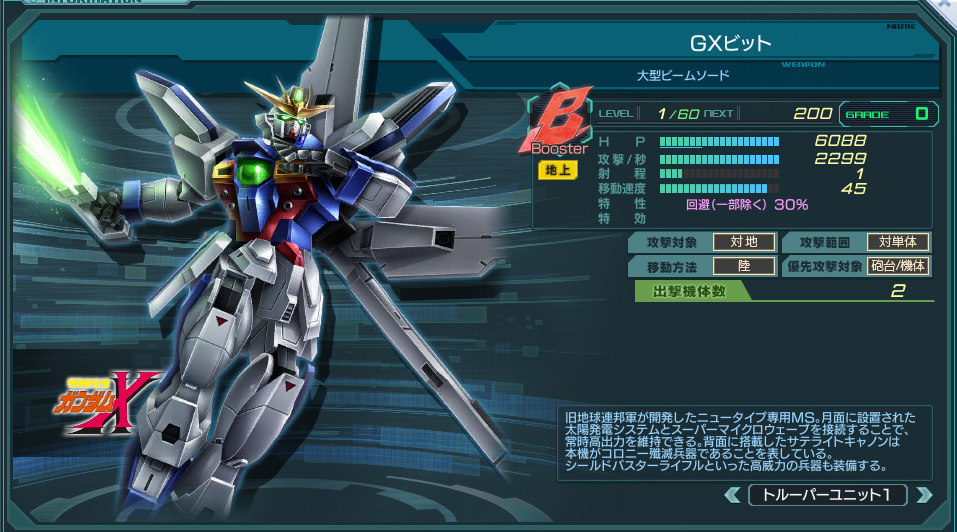 | Booster | 特性 | エース×1.5、 自分のトルーパーが撃墜される度、 (Gバーストゲージ+10%、HP回復3000) | ||