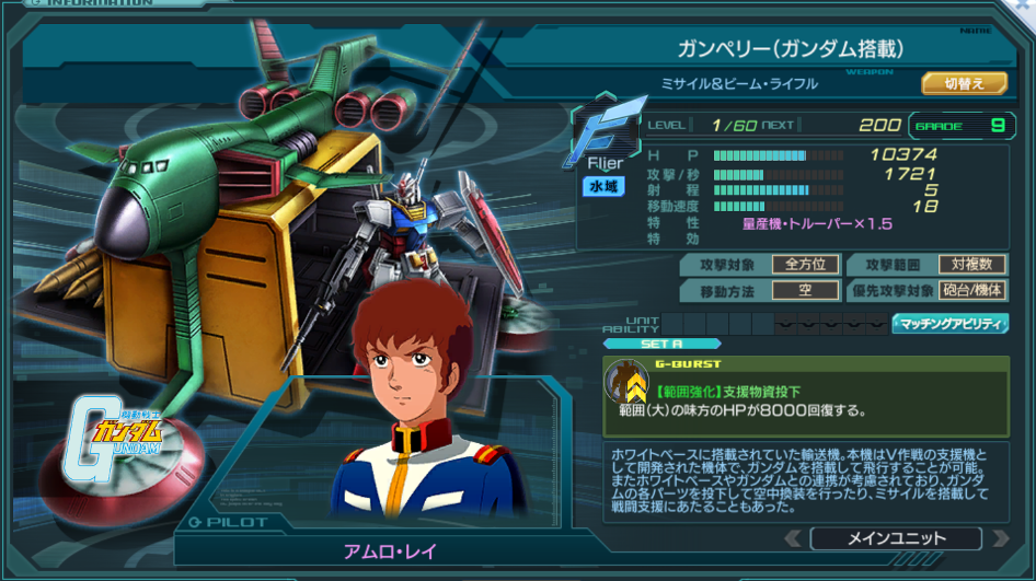 一覧 量産機 | エース | MA 最終ステータス 量産機 | エース | MA 比較データ エースGバースト | シリーズ別早見表 | 特性早見表| MS索引 赤字はレベルアップによるMAX値 基本ステータス