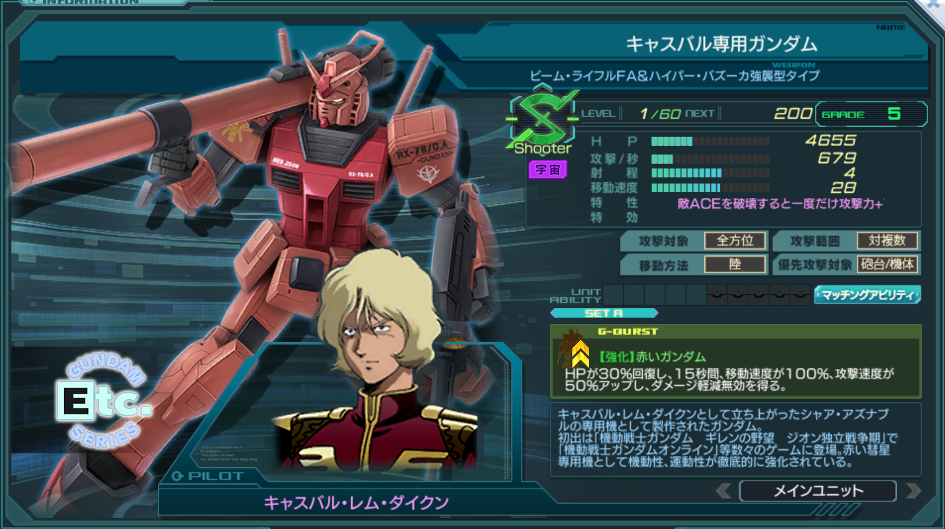 一覧 量産機 | エース | MA 最終ステータス 量産機 | エース | MA 比較データ エースGバースト | シリーズ別早見表 | 特性早見表| MS索引 赤字はレベルアップによるMAX値 基本ステータス