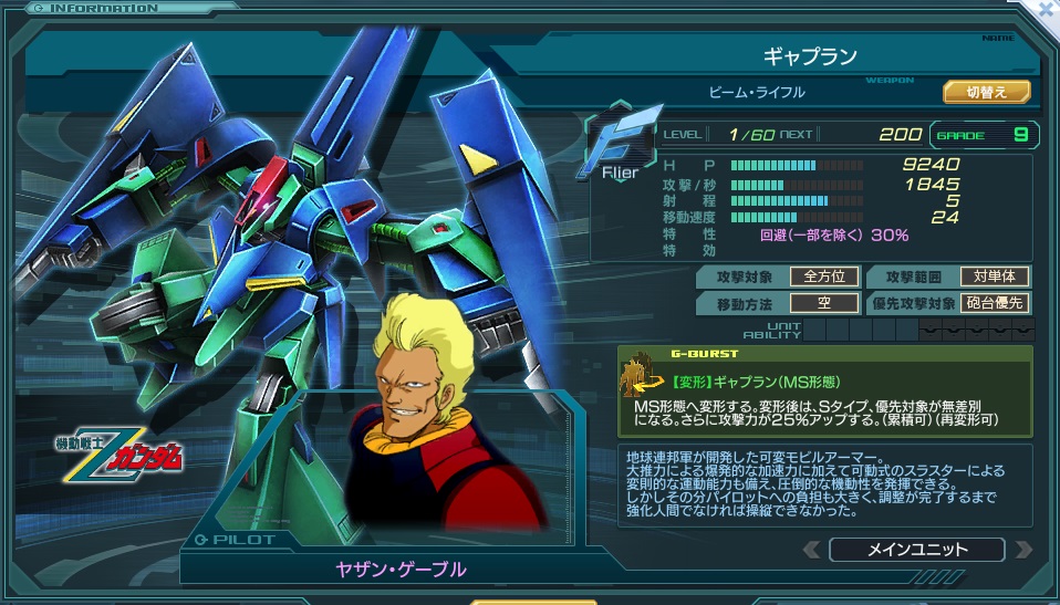 一覧 量産機 | エース | MA 最終ステータス 量産機 | エース | MA 比較データ エースGバースト | シリーズ別早見表 | 特性早見表| MS索引 赤字はレベルアップによるMAX値 基本ステータス