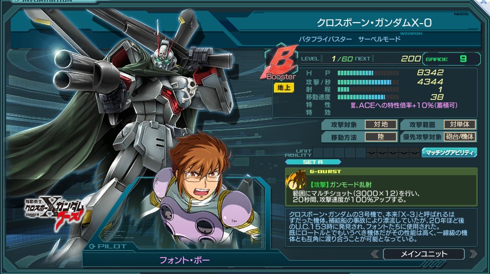| Booster | 特性 | 回避(一部除く) 50%、砲台×2、 攻撃Gバーストで防壁以外の敵を破壊する度、 ACEへの特性倍率+10%(蓄積可) ※G11時変化:砲台×2→砲台×2.5 | ||