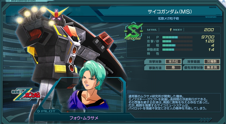 サイコガンダムからMA形態を排除したユニット。性能も若干向上している。 攻撃方法が討伐戦エリア4で出てきた際のGバースト発動後のように、右腕部ビーム砲→左腕部ビーム砲→腹部メガ粒子砲の3回攻撃。 攻撃間隔は3秒。