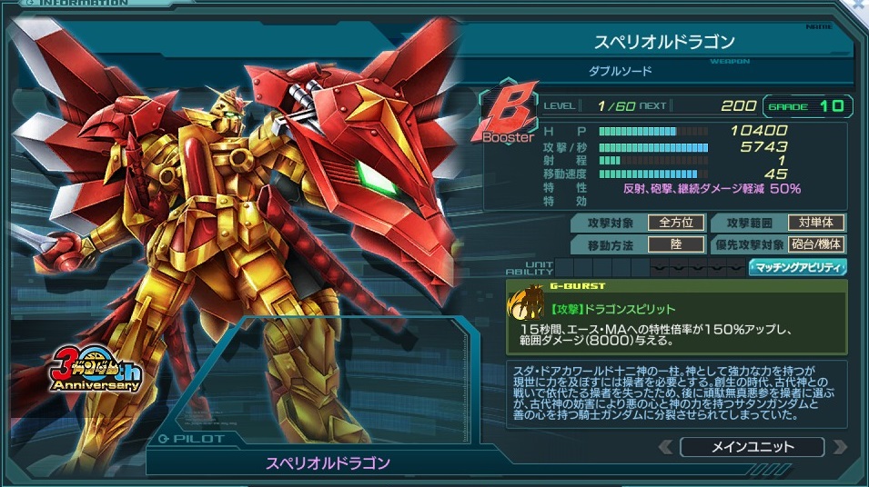| Booster | 特性 | 通常攻撃と攻撃Gバーストからの受けるダメージ上限値:3000 反射、砲撃、継続ダメージ軽減 50% HP回復(300/1秒) 出撃後30秒間、出撃中の味方エースの攻撃速度+100% 砲台×2 | ||