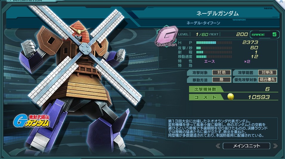 ネオオランダ代表のモビルファイター。英語版名称は「Hurricane Gundam(ハリケーンガンダム)」。