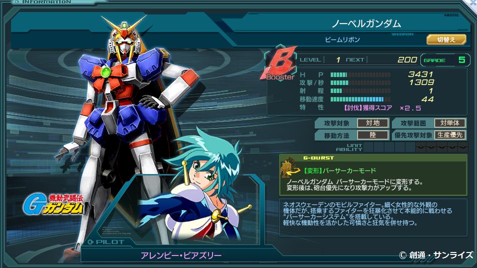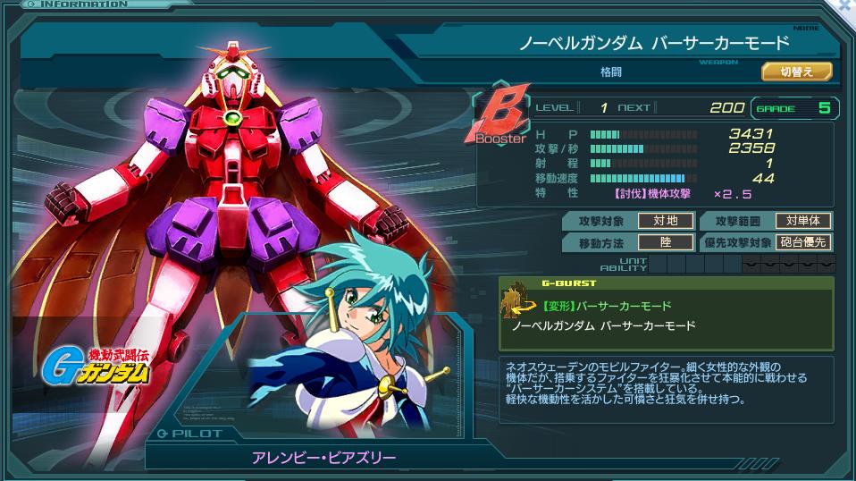 型式番号 GF13-050NSW ネオスウェーデンが第13回ガンダムファイトに向けて開発したMF。 その外見はセーラー服とハイヒールを身に付けた女性を模しており、その華奢な外見に見合った高機動戦を得意とする。 ガンダムファイトでは新体操を取り入れた戦法を展開し、ビームリボンとビームフラフープを武器に戦う。 その一方で、本機にはあるシステムが搭載されている。それが「バーサーカーシステム」である。 これは外部からパイロットを強制的にコントロールすると同時に、機体そのものも暴走状態(バーサーカーモード)に置くものであった。 暴走時は髪の毛状の頭部パーツが展開され放熱効率を上げるとともに、機体が赤く発光する。 またファイトスタイルも大きく変化し、機動力をさらに高めつつそれ以上に暴力的な鉄拳の連打を多用、 通常は新体操の用法に沿って使うビームリボンも鞭でシバキ倒すかのように振るっている。 劇中ではネオスウェーデンのアレンビー・ビアズリーが搭乗。 バーサーカーシステムの強制発動によりボルトガンダムを破るも、ゴッドガンダムとの対戦ではハイパーモードの前に敗北。 その後はゴッドガンダムとのタッグ戦で勝利を収めるも、パイロットごとネオホンコン首相ウォン・ユンファに拉致されDG細胞に感染。 ウォルターガンダムに変異した後、ライジングガンダムにより破壊された。 救出されたアレンビーはデビルガンダムとの最終決戦において、再びノーベルガンダムを駆り戦線復帰しているが、 この際の出自には諸説ある(元通り修復したもの、2号機、強化型の「高機動ノーベルガンダム」etc)。 なお余談であるが、本機のデザインモチーフは月に代わっておしおきする某美少女戦士である。