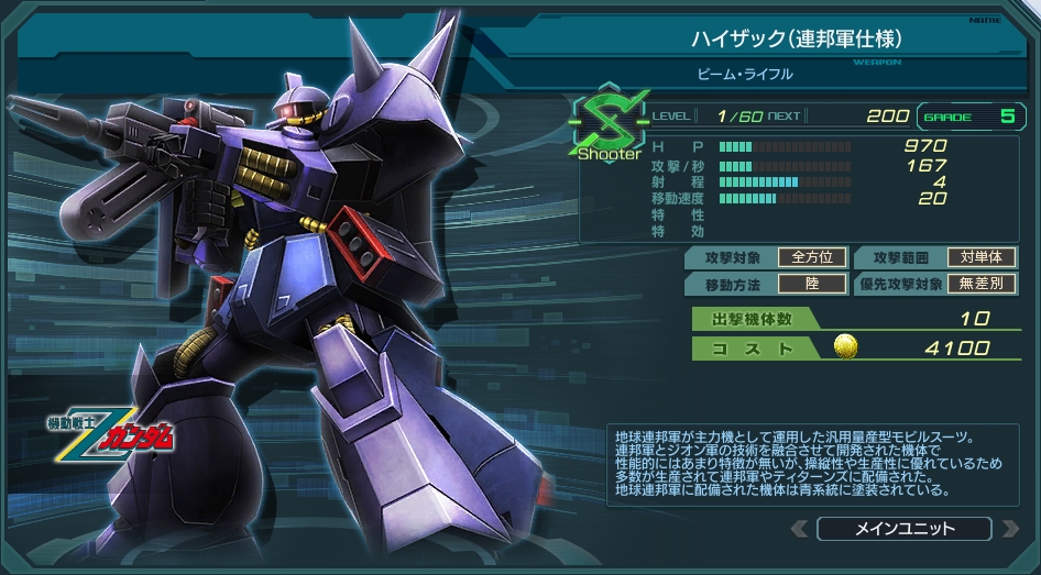 性能面はジム(ランドセル装備)に近しい耐久力のあるタイプでありながら、量産S型最速の20を保持している。