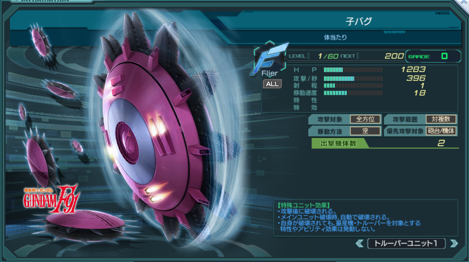 | 特殊ユニット効果 | ・攻撃後に破壊される。 ・メインユニットが破壊時、自動で破壊される。 ・自身が破壊されても、量産機・トルーパーを対象とする 特性やアビリティ効果は発動しない。 | |||