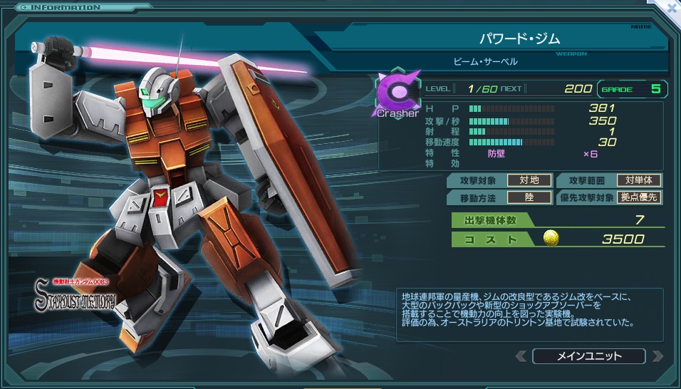 一覧 量産機 | エース | MA 最終ステータス 量産機 | エース | MA 比較データ エースGバースト | シリーズ別早見表 | 特性早見表| MS索引 赤字はレベルアップによるMAX値 基本ステータス