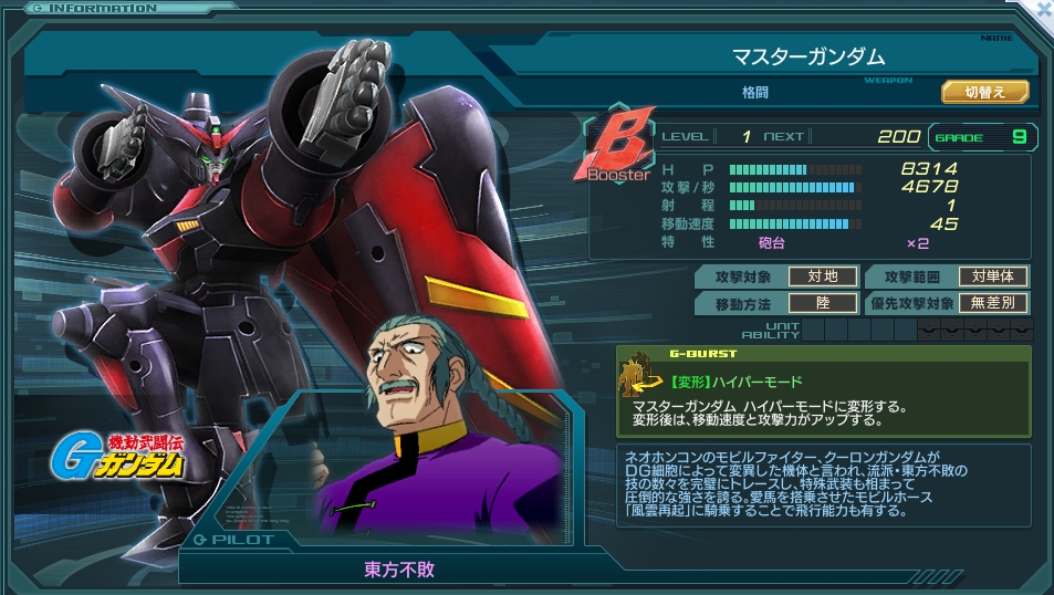 DPSはゴッドガンダム(明鏡止水)に次いで、全エース中2位である。対砲台戦でもゴッドガンダム(明鏡止水)に次ぐ火力値を誇る。 ただし攻撃間隔が3秒と、全Boosterエースの中で最長のため、通常形態では施設破壊には不向きである。 Gバーストを発動すると攻撃間隔が1.5秒に短縮されるため、アビを付けて素早く発動させるよう工夫するか、対エース1.3倍の特性を活かして、いっそ対エースキラーとして割りきって使うのがよい。