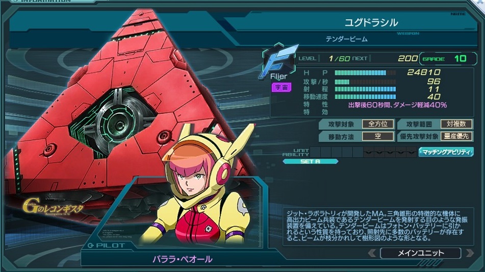 | Flier | 特性 | 出撃後60秒間、ダメージ軽減40% 量産機・トルーパー×1.3 | ||