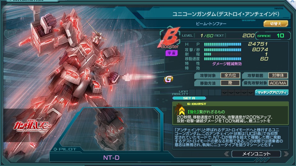 | Booster | 特性 | 回避(一部除く)85% 命中60% ダメージ軽減70% 貫通 ダメージ軽減無効 通常攻撃と攻撃Gバーストから受ける;ダメージ上限:2000 出撃後30秒間、出撃または配備中の味方ユニットのHPが回復する。(3%/1秒)※変形後も状態を引き継ぐ ACE・MA×3 | ||