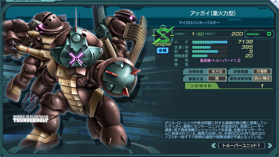アッガイのバリエーション機として、OVA劇中では南洋同盟の支配地域に潜入している諜報員の |
