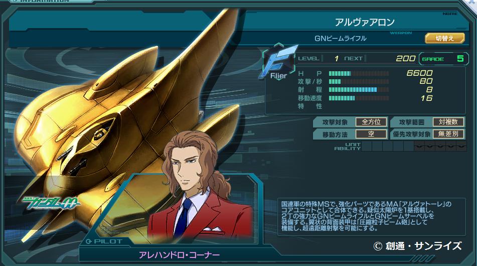 型式番号 GNMA-XCVII 国連軍の大型モビルアーマー。七基もの疑似太陽炉を搭載しており、圧倒的な出力を誇る。 主兵装の大型GNキャノンはその出力の恩恵を最大限に活かしており、長射程かつ高威力の超兵器と化している。 また、大出力により極めて堅固なGNフィールドも展開可能であり、ビームやミサイルでは歯が立たない。 その他にも6基の大型GNファング、接近戦用のクローアーム、弾幕形成用の13門のGNビーム砲が装備されている。 そしてこのモビルアーマーは、実はアルヴァアロンの強化ユニットに過ぎない。 このためGNビーム砲の内、前面の2門はアルヴァアロンの武装を露出させて使っている。 劇中ではソレスタルビーイングと国連軍との決戦において、国連軍側の援軍として登場。 大型GNキャノンでプトレマイオスに甚大なダメージを与え、ガンダムキュリオスにも右半身を消し飛ばす大損傷を与えた。 その後GNアーマー TYPE-Eの襲撃を受け、アームズ側の破壊に成功するが自らもファングとクローアームを破壊され、 さらに分離したガンダムエクシアの強襲を許してしまい、装甲をズタズタに切り裂かれてしまう。 これによりアルヴァトーレは破壊されたが、そのまま内部からアルヴァアロンが姿を現し、アレハンドロは戦闘継続した。 なお、本機の特徴としてあらゆる要素が金色ということが挙げられる。 全身の機体色はもちろん、放出されるGN粒子やGNフィールド、果てはパイロットスーツやヘルメットも金色である。 一応、金色の塗装には耐ビームコーティング効果があるものの条件が揃わないと効果がなく、 さらに戦場では目立ちすぎる色のため、本機以外で採用されたことは一度たりともない。 本機において全面的に採用されたのは、ひとえにパイロットであるアレハンドロ・コーナーの趣味によるものである。