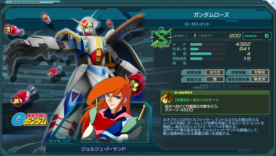 型式番号 GF13-009NF ネオフランスの第13回ガンダムファイト用に開発したモビルファイター。 その外見はナポレオン時代の騎士を模したものである。 レイピア状の実体剣「シュバリエサーベル」による剣技と、左肩部シールド内に格納された遠隔攻撃端末「ローゼスビット」を武器とする。 必殺技はビットを敵機の周囲に展開し、電流で覆われた空間に包む「ローゼススクリーマー」。 さらにギアナ高地での修行後はビットを竜巻の如く回転させ、エネルギーの渦に巻き込み行動不能にさせる「ローゼスハリケーン」も体得した。 劇中では一貫してネオフランスのMFジョルジュ・ド・サンドが搭乗。 ガンダムファイトではビット兵器の持つ射程の長さは活かしにくいものの、デビルガンダム軍団との戦いでは遺憾なく発揮された。 また、見た目にそぐわぬパワーにより超巨体のグランドガンダムを持ち上げ、ガンダムマックスターのトドメに繋ぎこれを撃破している。 余談だが、本機の必殺技ローゼスハリケーンは生身のジョルジュも使用可能だが、その際はビットではなく本物の薔薇の花弁を使う。