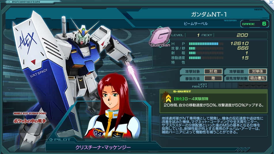 ログインボーナスで入手できるG型エース。 入手グレードが6と高めでガンダムアシュタロンと比肩するスペックを持つ。 ステータスバランスも攻撃重視型で、アシュタロンやソードストライクガンダムに近い。 攻撃間隔が1秒だが、Gタイプは攻撃1回毎に索敵(2秒)+位置取り(約0.5秒)を行うため、索敵時間が増えてしまい火力の低下を招く。 反面、索敵は細かく行うので、砲台の囮にはなりやすい。 特筆すべきはGバーストで、G型エースとしては初となる移動速度の強化が可能。 ソードインパルスガンダムのように常時高速で移動させる必要はないが、 B・C型を突入させる際など一気に前に出したい時に真価を発揮する。 ただし移動速度強化の代償として、火力増強は控えめ。 オールF型編成など進軍調整が不要な際は一歩劣るので、機体構成面で使い手を選ぶエースと言えるだろう。