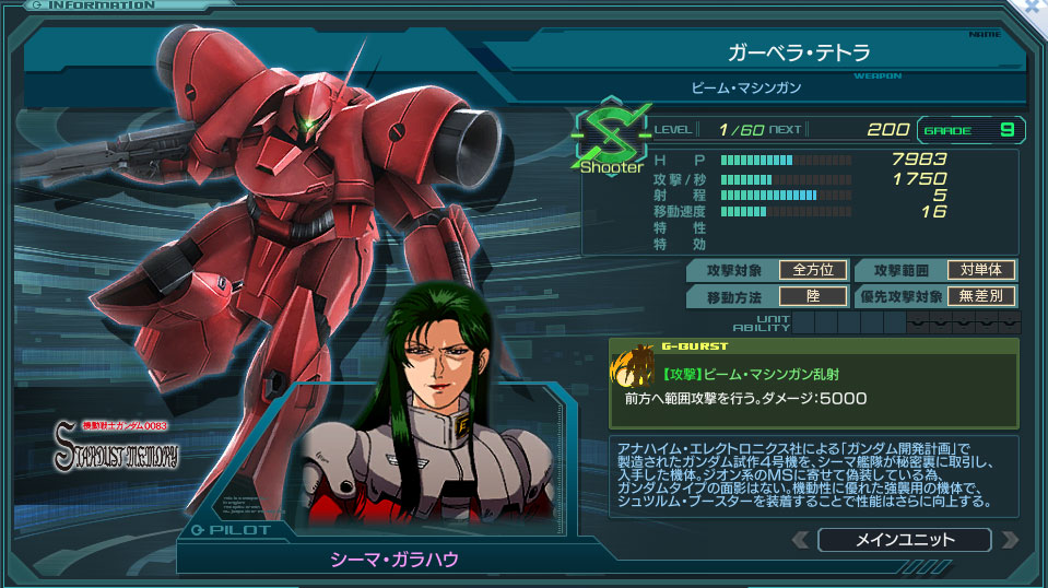 一覧 量産機 | エース | MA 最終ステータス 量産機 | エース | MA 比較データ エースGバースト | シリーズ別早見表 | 特性早見表| MS索引 赤字はレベルアップによるMAX値 基本ステータス