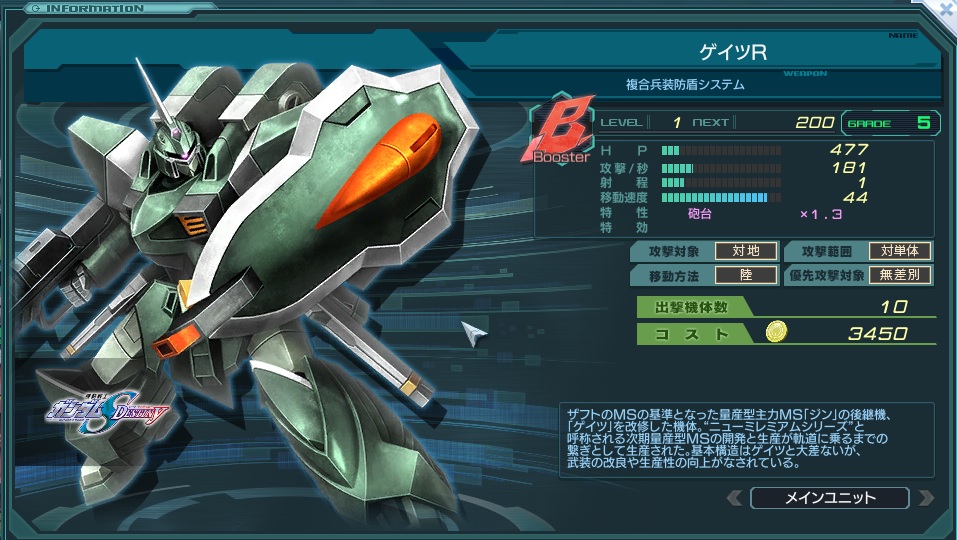 ※テクニカルラボでの改修時間50%OFF。イベント終了後も継続。 量産Bでは初の無差別、「生産と砲台の両方にボーナス」機体(エースを含むならゲルググ・M(シーマ機)に次ぐ)。 HPや攻撃/秒はグレード相応で、優先対象:無差別が有利に働くか不利に働くかはマップ次第。 イベント機体のために改修の所要時間が半減される点は長所。 しかし対砲台ボーナスの低さは、基地攻撃では決定的な短所となる。 迎撃戦や討伐戦など、砲台を殴らなくて済む戦闘に用いたい。 迎撃戦「自由と正義と運命と」ではHP・攻撃共に3倍という強烈な特効が発生するため、 G8時点でG10ガンダムMk-Ⅱ(ティターンズ)以上の火力にG10シルバースモー以上の耐久力を併せ持つ性能を発揮する。リミテッドクエスト産量産機の面目躍如だろう。 その後に採用されるか否かは、SEED DESTINYシリーズサポーターの実装有無と引き具合に左右される。