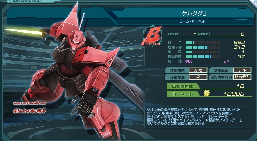 型式番号 MS-14JG ゲルググを統合整備計画によって再設計した性能向上機。 空間戦闘におけるアドバンテージの向上と高い整備性、機能性を得るために基本設計から見直された機体であり、 既存の装甲も大幅に変更され、よりシャープなデザインとなっている。 背部に大型スラスターユニットを追加したことで、原型機の3倍、高機動型と呼ばれたB型の2倍近い圧倒的なスラスター総推力を誇っている。