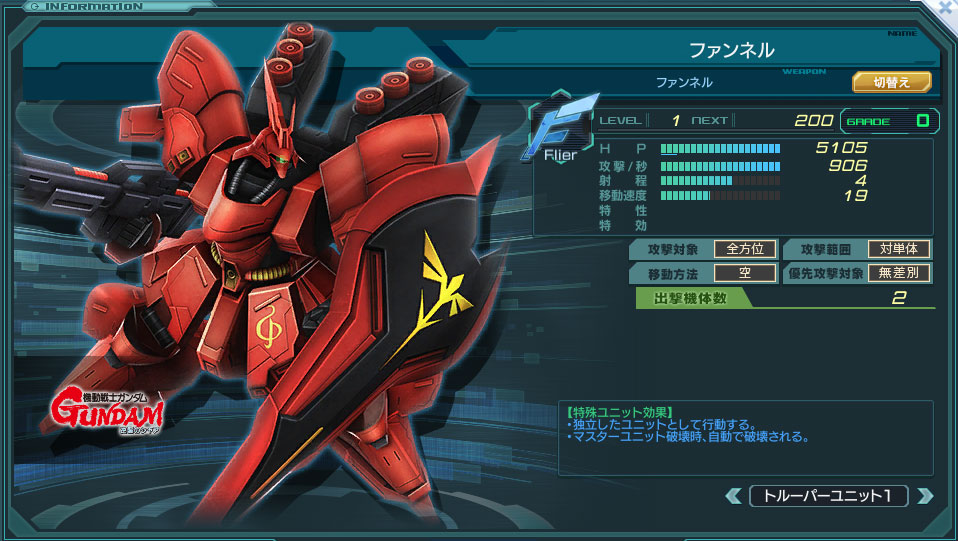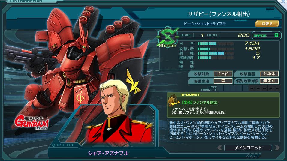 メインユニットのサザビーは射程5で、HP、DPSともShooterエース機の中では現状最高クラスである。
