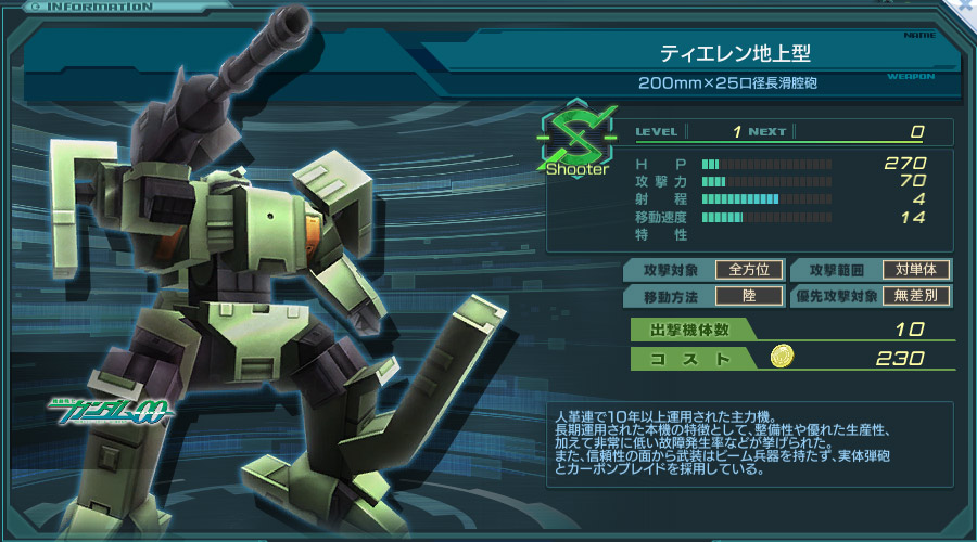 足回りも悪いのがネック。総合火力だと機体数が多いザクⅡやトーラスのほうが優位だったりと悲しい機体。