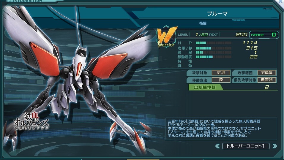 | 出撃後、180秒間、10秒経過する度にHPが10%回復し、プルーマが1体出現する。 | |||