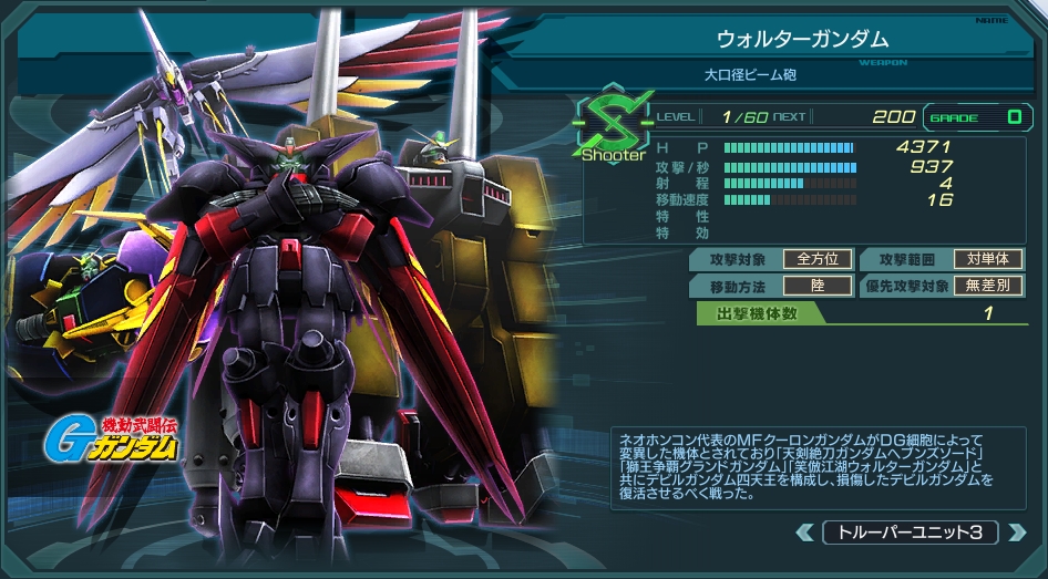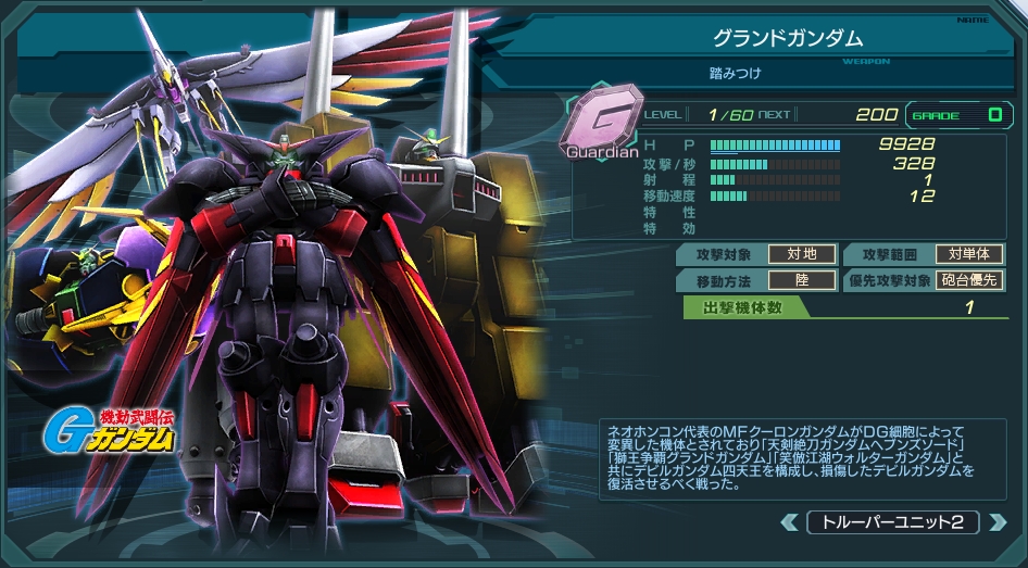 タイプ違いのトルーパーユニット3機を従えてるのが特徴。グランドガンダムのみ砲台優先なので特に前に出て壁になる。