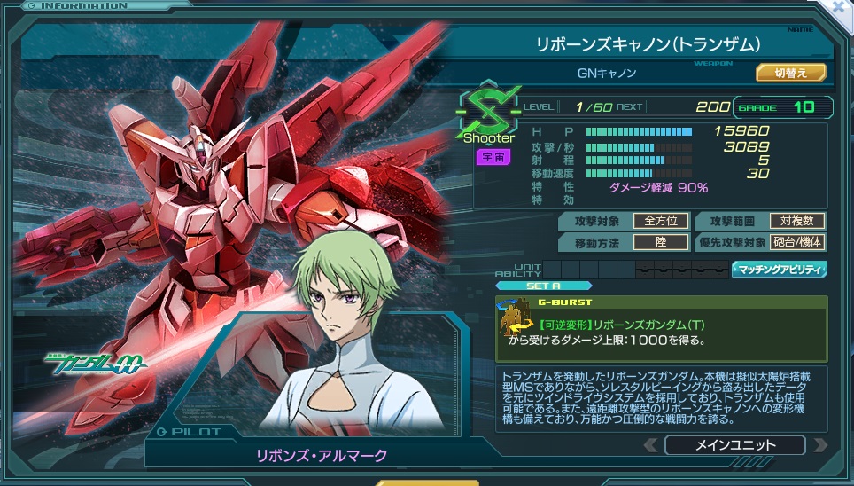 | HPが50%回復し、Fタイプに変形する。15秒間、攻撃力が100%アップし、 貫通、通常攻撃と攻撃Gバーストからのダメージ上限:1,000を得る。 | |||