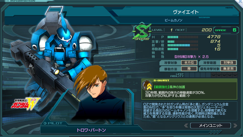 射程5かつ範囲強化持ちと、デュエルガンダムASに近しい運用感覚を持つエース。