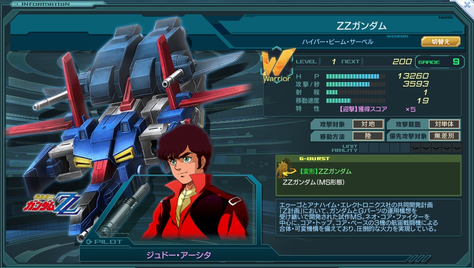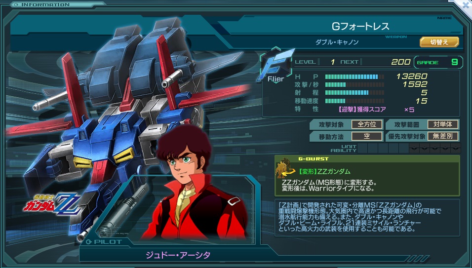 ZZガンダムの性能バリエーション。ただし使用感は全く異なる。 というのも、本機は機体名通りGフォートレス形態で出撃し、GバーストによりZZへ変形するためである。 出撃時のGフォートレス形態は、F型随一とも言える高耐久が特徴。 代償として火力は抑え目になっているので、生存力の高さでカバーしていきたいところ。 Gバースト発動により変形し、W型のZZガンダムになる。 性能的にはZZガンダム(ガンダムチームA)に近いが、ハイメガキャノンは撃てないことに注意。