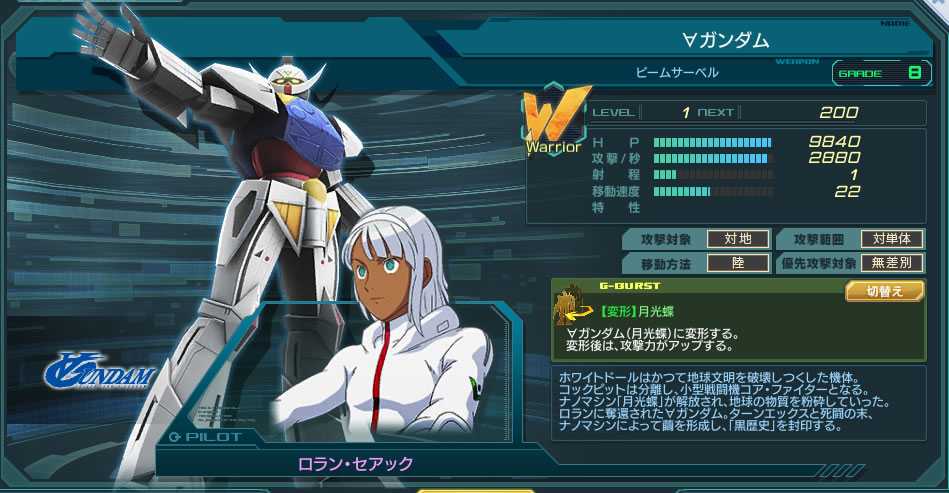 一覧 量産機 | エース | MA 最終ステータス 量産機 | エース | MA 比較データ エースGバースト | シリーズ別早見表 | 特性早見表| MS索引