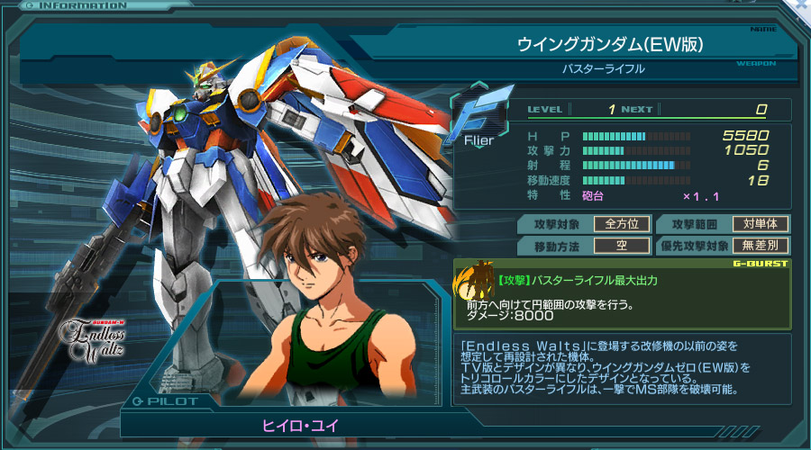 ウイングガンダムの上位互換。Gバーストも更に+1000されている。 攻撃間隔が1.5秒に向上したため、実質ダメージは1.5倍に。 また、特性が生産1.1倍から砲台1.1倍に変わっている。 ただし、Gバースト使用までの時間は延びているため、ラボ狙いで出さないとかなり溜めづらい。