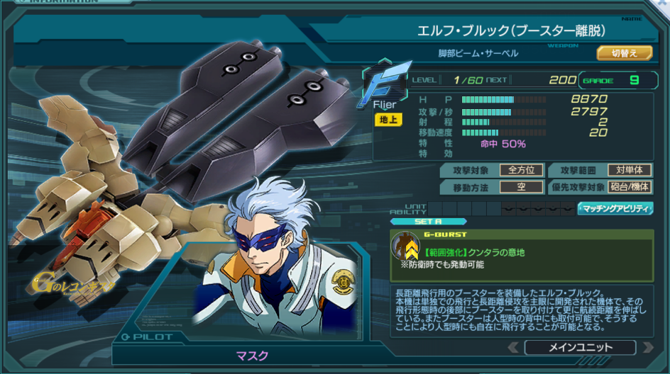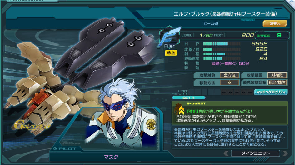 | Flier | 特性 | 命中 30% 回避(一部除く) 50% 量産機・トルーパー×1.5 ※G11時追加:ACE×1.2 | ||