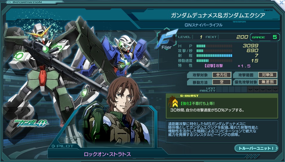 ガンダムデュナメスの調整版。 主な変更点はトルーパーユニットとしてガンダムエクシアが付いたこと、Gバーストが自己強化型になったこと、 そして砲台優先ではなく無差別になったことの3つ。多少性能差はあるが、他は基本的に通常のデュナメスに準じている。 さすがにトランザム仕様ほどの爆発力はないものの火力を上げやすく、 無差別設定になったことで対空ミサイルに自分から突っ込んで事故死するケースが起きにくいので、安定性は単体版を上回る。 トルーパーユニットのガンダムエクシアは単体版の特性が生産×2だったのが、こちらは砲台×2に変更されている。 性能は単体版(初期でG5)より一回り低く抑えられており、おおむねG4のBoosterエース相当である。 なお制圧戦でデュナメスが置かれやすいアウトレンジの配備場所と相性が悪いので、過大な期待はしないように。 もっとも輝くのは迎撃戦で、F型の弱点である「対地攻撃機のタゲ取りができない」部分を補う上に多少の前線援護ができるのはオイシイ。