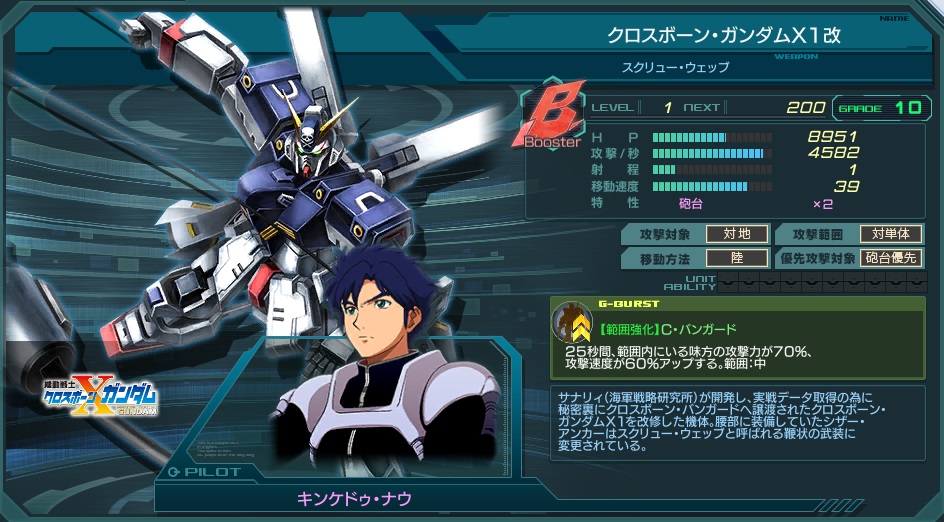 設定通り、開発前段階機体であるクロスボーンX1のマイナーチェンジ機体。 スペックの傾向はほぼ同じだが、優先設定が砲台優先に切り替わっている。このため動かし方は少々変わってくる。 ガンダムデュナメスとケルディムガンダムのように、攻略対象に合わせて通常のX1とこちらの2機から向いている方を使うという運用ができるのは便利。 そして、注目すべきはGバーストの効果変更。攻撃力UP効果がクーロンガンダムと同じ70%まで落ちたが、代わりに攻撃速度が60%も上昇する。 このため時間あたりの爆発力ではX1、クーロンの両者を上回る。討伐戦のように大火力が必要とされる局面で真価を発揮するだろう。