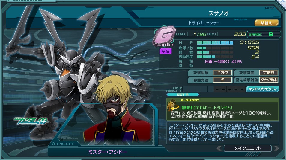 | Guardian | 特性 | 回避(一部除く)40% 命中50% ダメージ軽減40% ACEx1.2 量産機・トルーパーx1.5 | ||