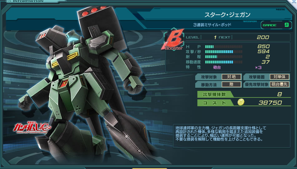 B型にして射程2であることが最大の特徴。 壁越しに砲台破壊ができる他、被弾に弱いB型としてはW型やG型といった射程1機体を盾にしやすいのも魅力的。 GRADE9だけあって基本性能もアビゴルを凌ぐが、出撃数が1機減っているため、より丁寧な運用が求められる。