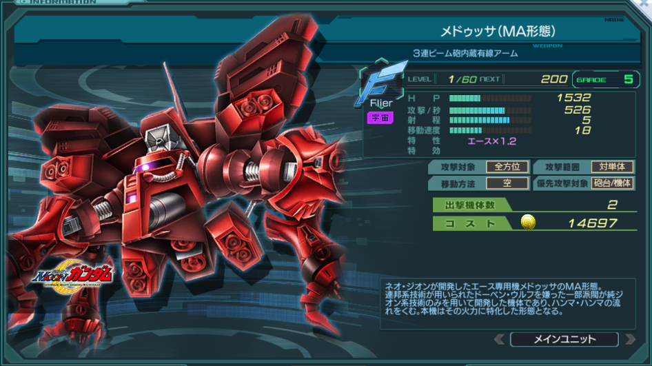 一覧 量産機 | エース | MA 最終ステータス 量産機 | エース | MA 比較データ エースGバースト | シリーズ別早見表 | 特性早見表| MS索引 赤字はレベルアップによるMAX値 基本ステータス